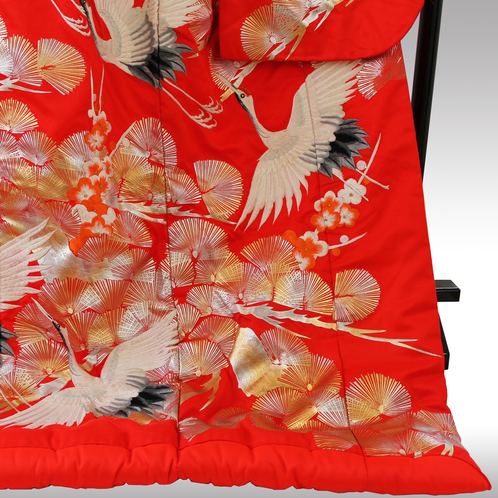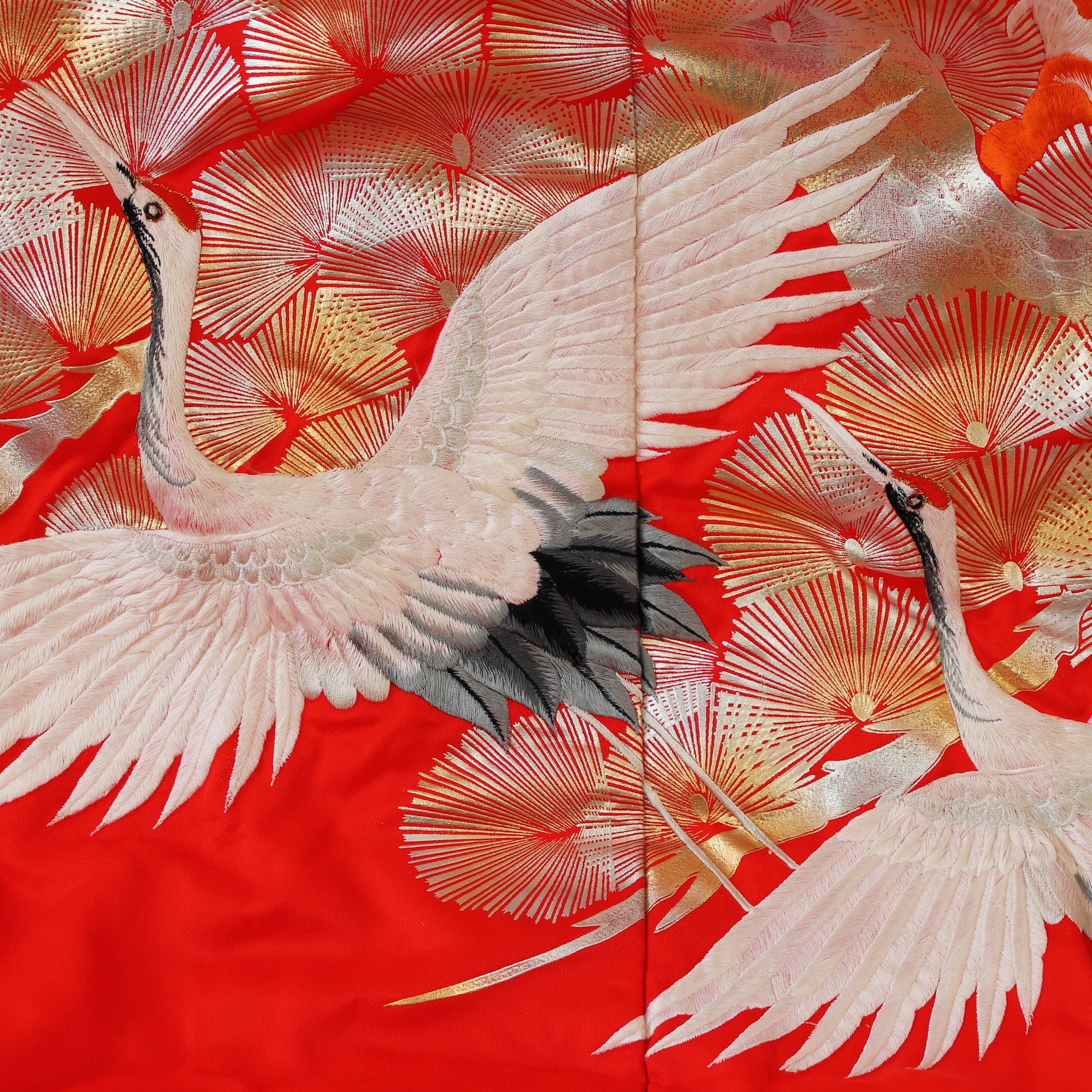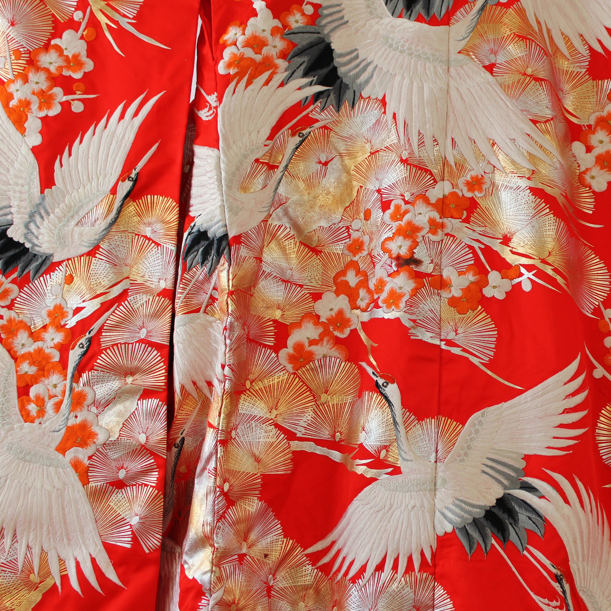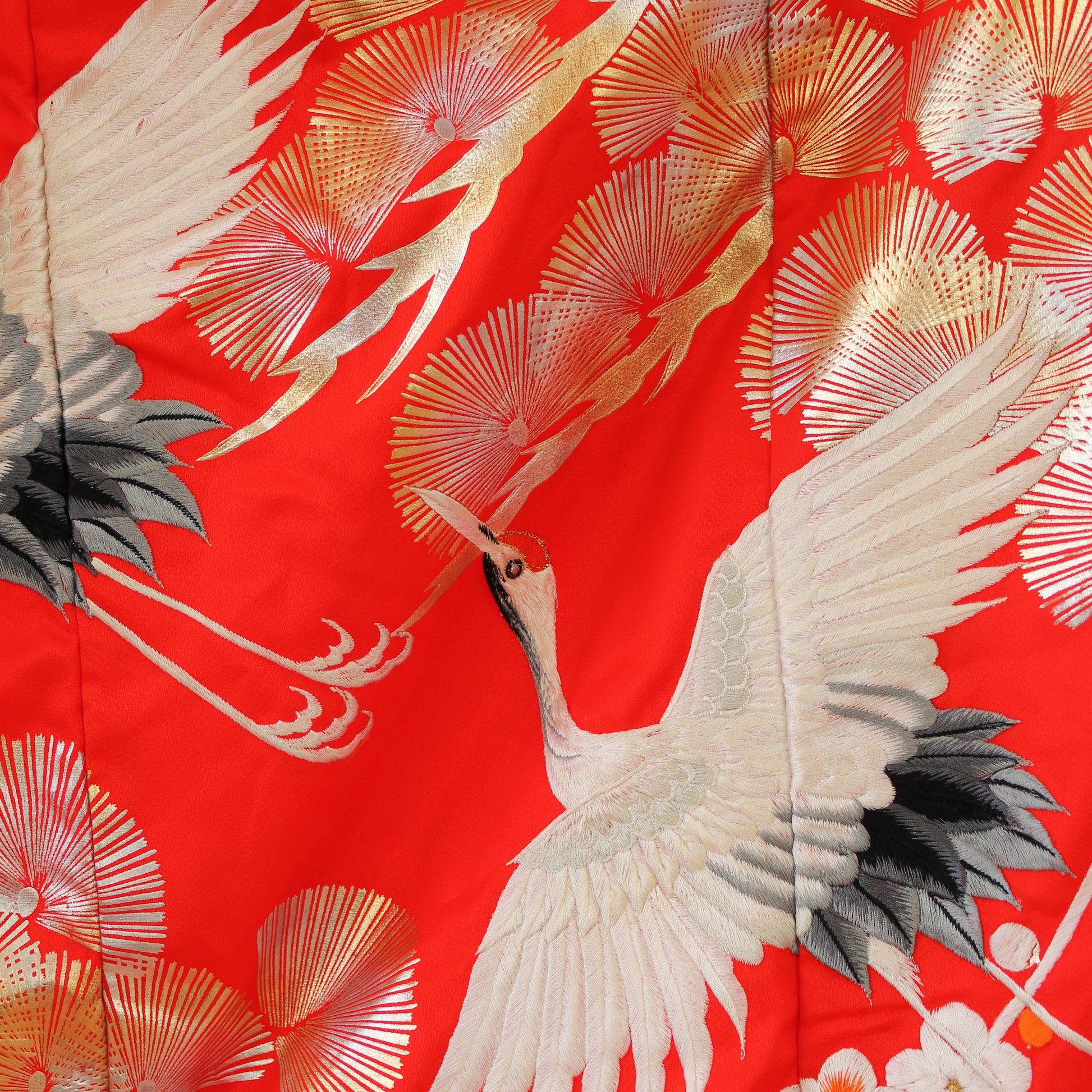 朱赤の打掛です。金箔、銀箔が施された、飛び鶴と梅の総刺繍、総柄の絢爛豪華なデザインです。