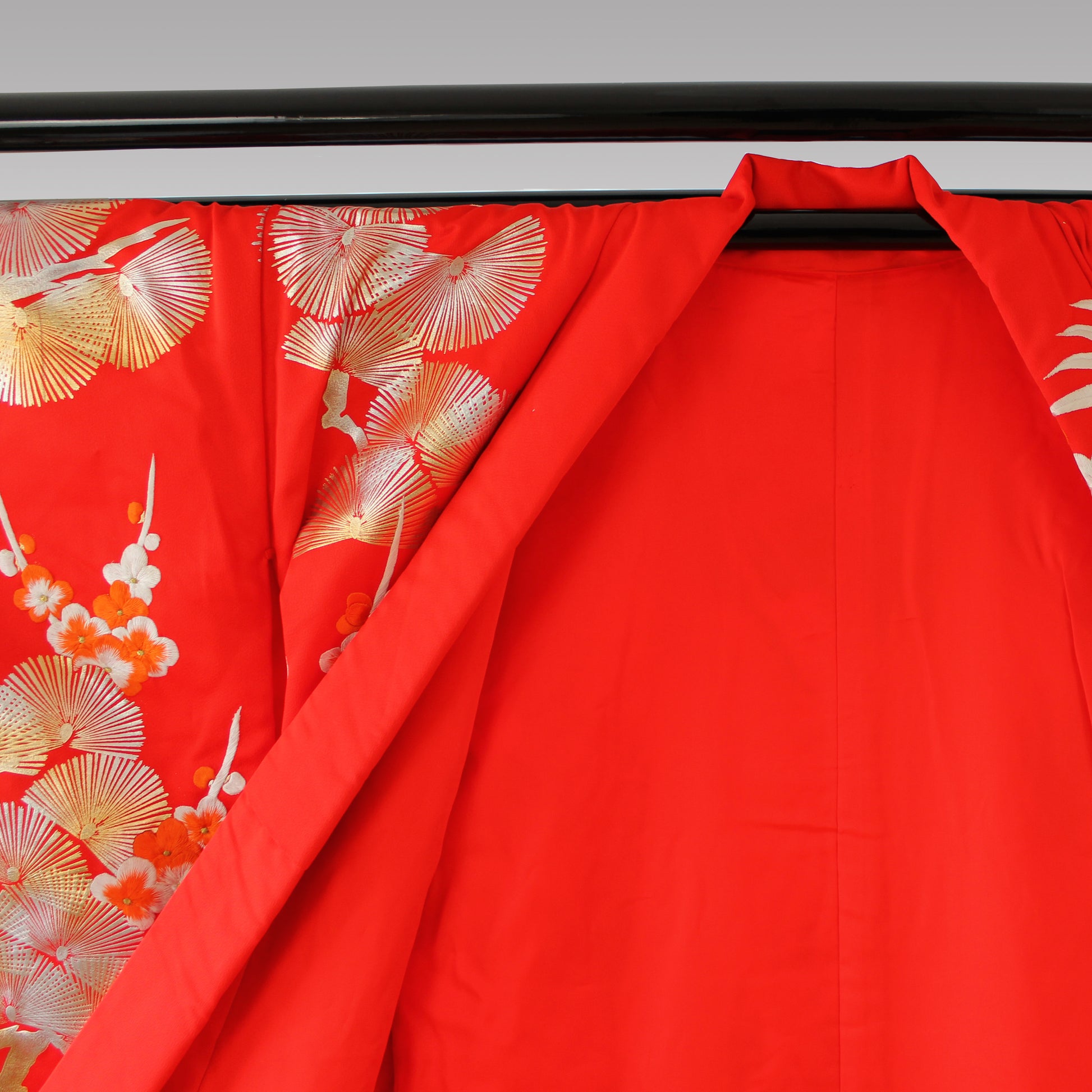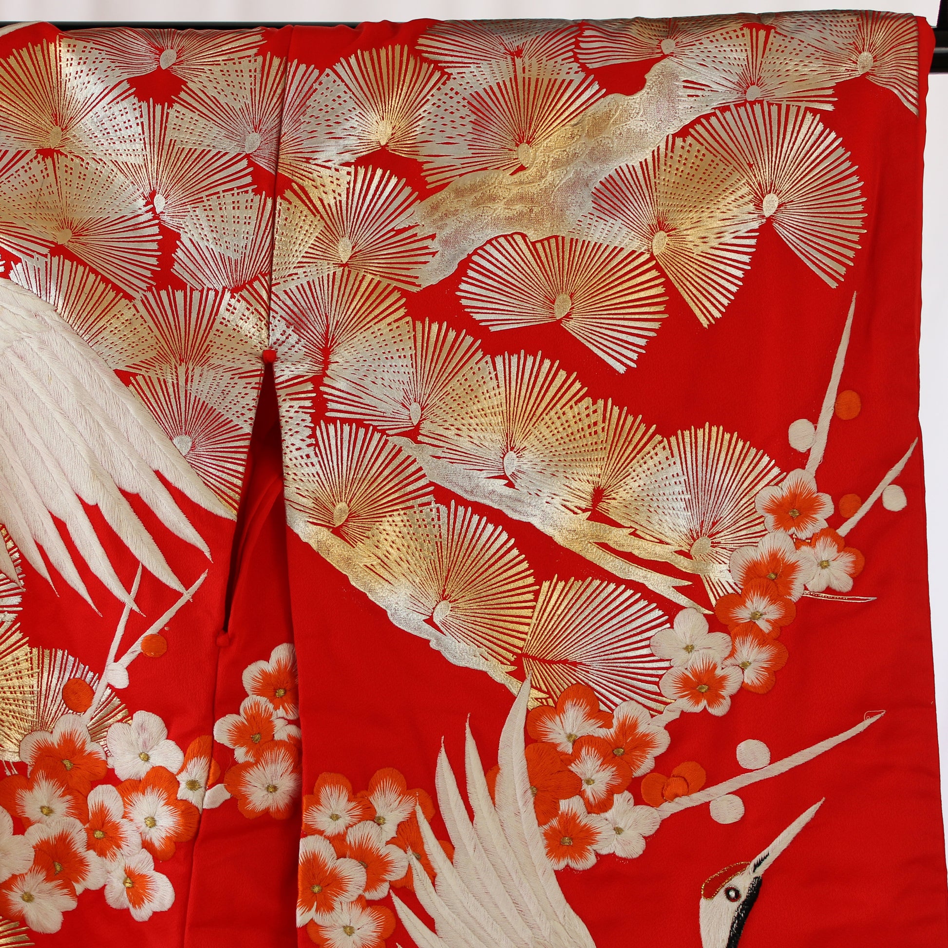 Kimono Uchikake(打掛) Vermilion-Red FlyingCrane Plum Embroidery GoldLeaf SilverLeaf Japanese Traditional Clothing Japan