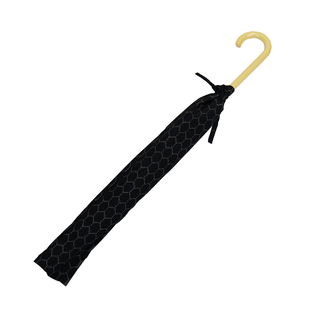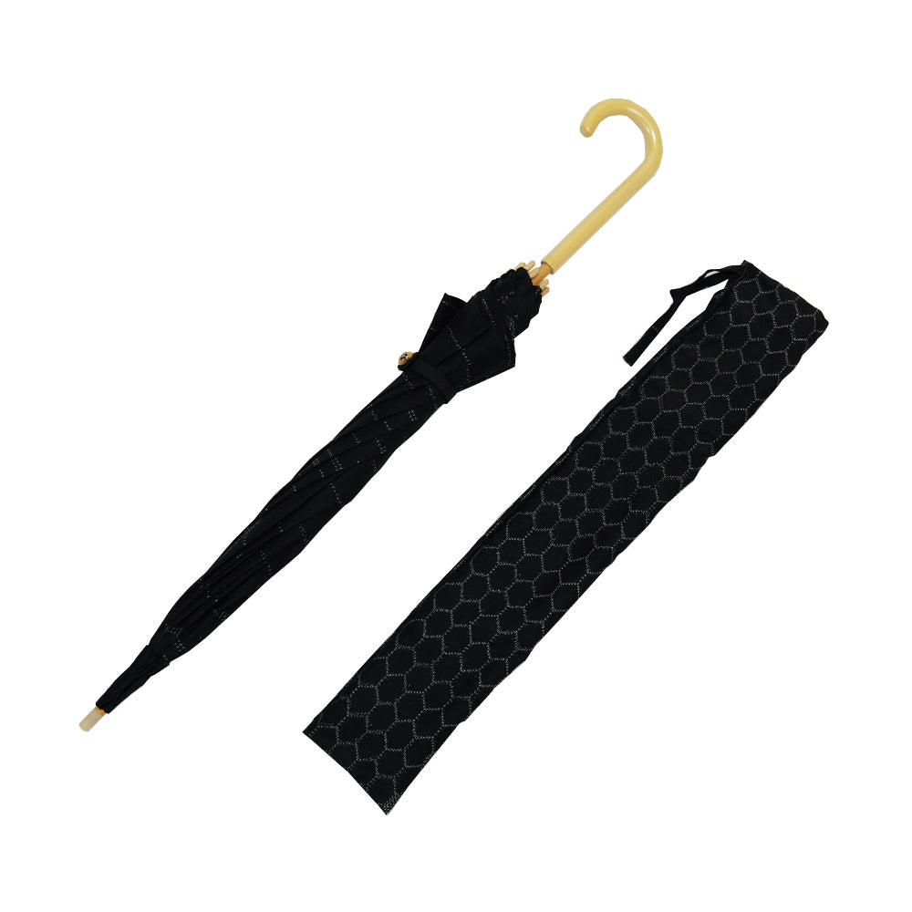 I made a parasol out of black Oshima Tsumugi.By aligning the kasuri pattern with the edge of the parasol, the design is such that it appears beautifully in a radial pattern.The black geometric design is also recommended for a chic look.This is a parasol, so it cannot be used in rainy weather.